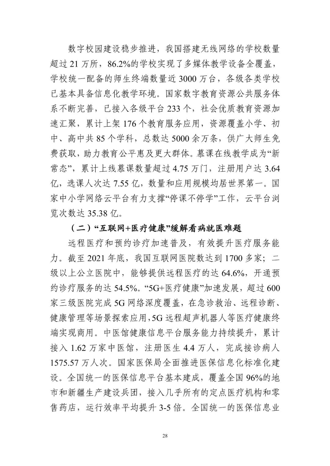2017年到2021年,我國網民規模從7.72億增長至10.32億,互聯網普及率提升至73%,特別是農村地區互聯網普及率提升到57.6%,城鄉地區互聯網普及率差異縮小11.9個百分點。國家智慧教育平臺加快建設,我國所有中小學(含教學點)全部實現聯網。全國統一的醫保信息平臺建成,實現跨省異地就醫自助備案和住院直接結算。互聯網應用適老化及無障礙改造行動深入開展。網絡扶貧和數字鄉村建設接續推進,城鄉居民共享數字化發展成果。