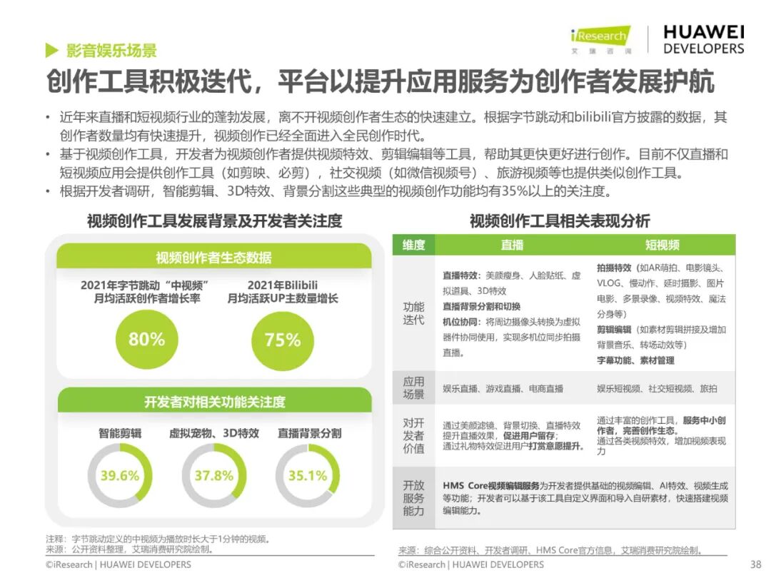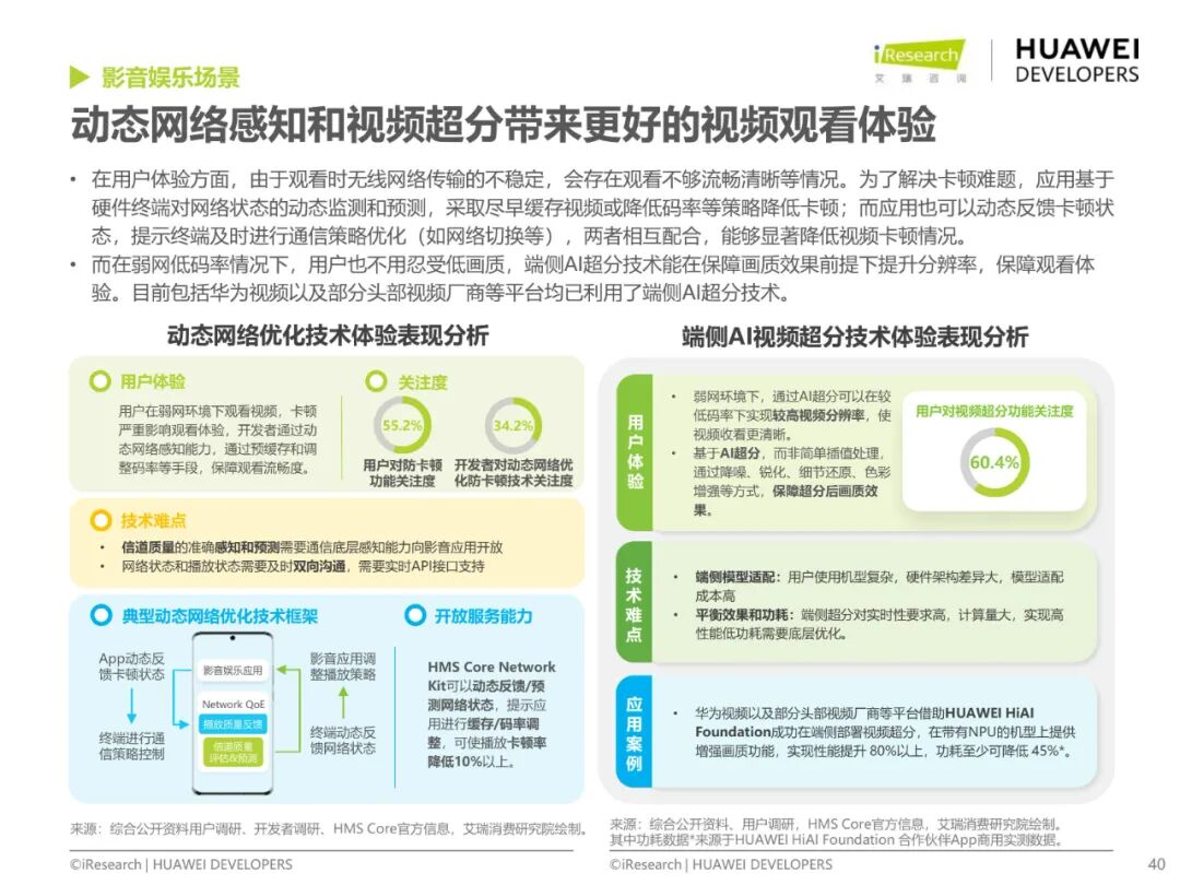 在影音應用的創作端,依托媒體和AI技術進步,影音應用向創作者提供視頻剪輯、特效、字幕等一系列創作工具,讓音視頻創作更便捷、更智能;在體驗端,影音體驗向更高清、更沉浸方向發展;而基于終端底層網絡感知能力和終端AI硬件能力加速,影音應用可通過提前緩存、動態碼率調整以及端側AI超分提升高清觀影的流暢性。