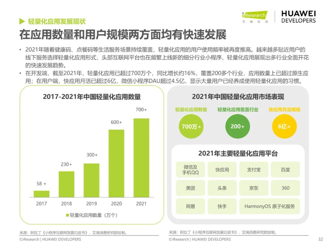 隨著健康碼、點餐碼逐步普及,用戶對輕量化應用的使用習慣已逐步建立;基于輕量化應用免安裝、轉化高、省資源的特點,輕量化應用正在深度融入日常生活,2021年全網輕量化應用數量超700萬,同比增長約16%。輕量化應用在跨端服務方面也有拓展,如原子化服務通過服務卡片觸達用戶,通過分布式架構實現一次開發、多端部署,讓應用隨用戶跨端流轉。