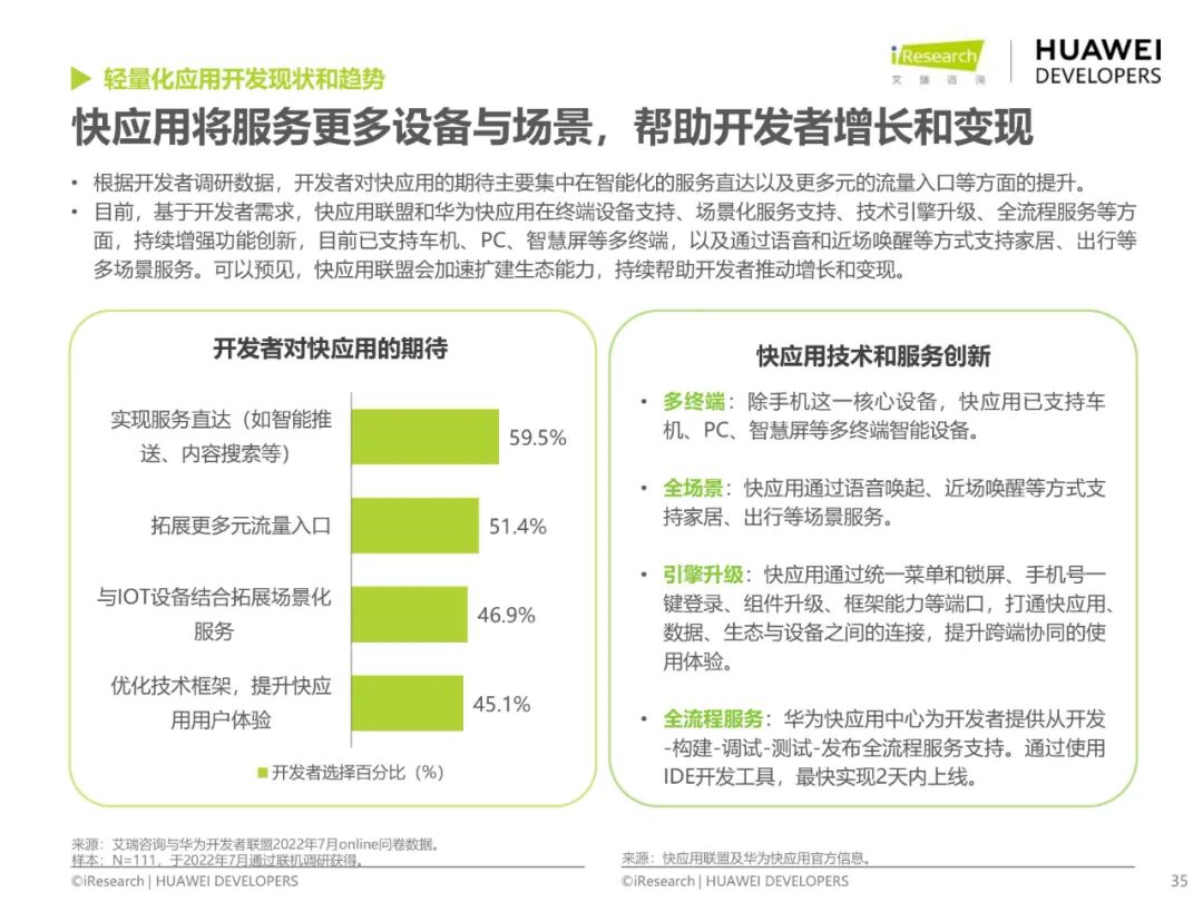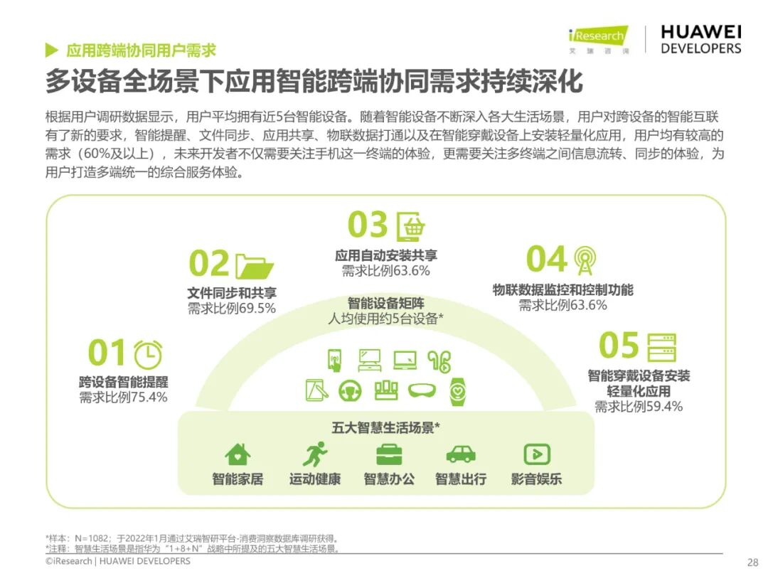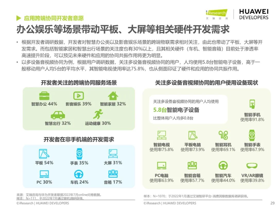 智能終端格局方面,目前手機為核心搭配智能設備矩陣的格局在未來3-5年不會明顯改變,但用戶已不局限于單一設備,在智慧辦公、影音娛樂、智慧家居等場景均有豐富的跨端使用需求,跟隨用戶需求,開發者在平板、手表及大屏等設備上開發投入了更多精力,但跨端開發難度大,在跨端基礎功能、數據同步、通訊協議等方面,開發者期待底層能力支持。