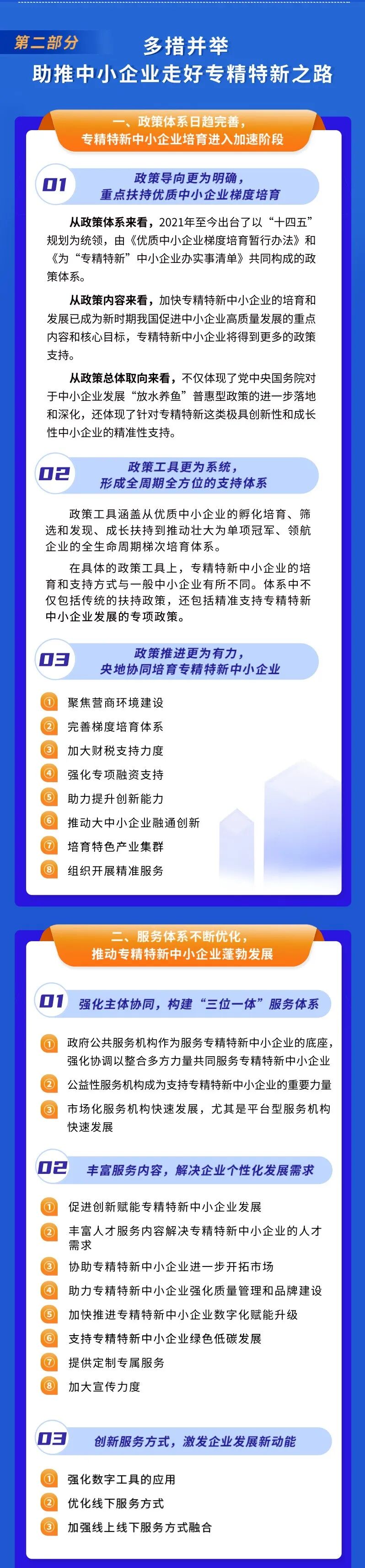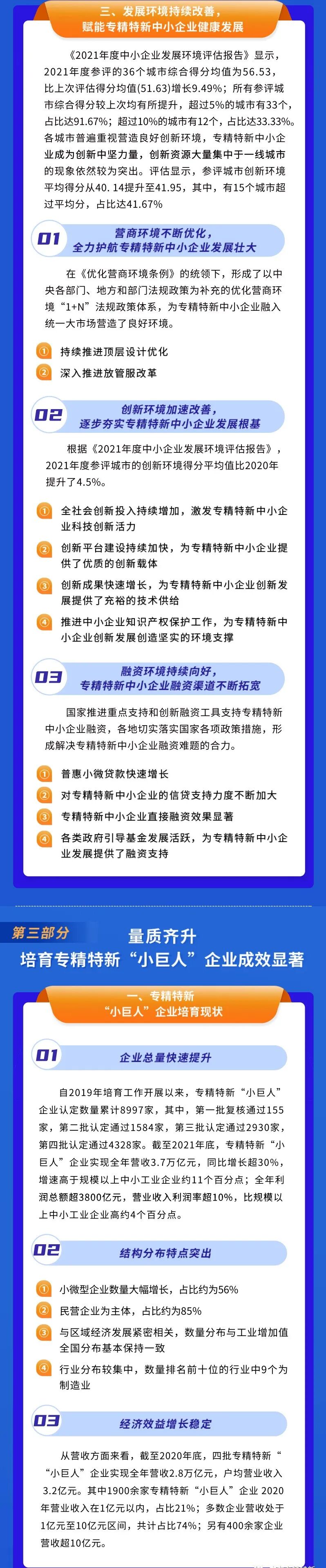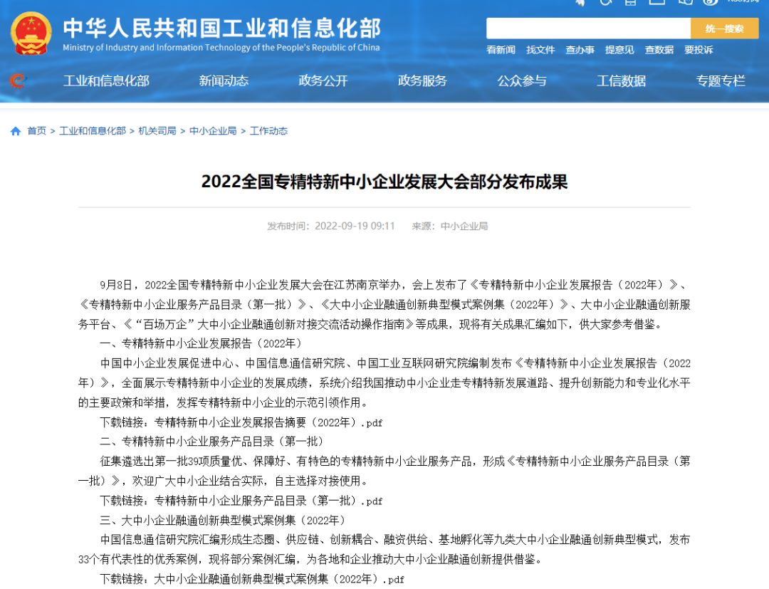 9月19日,國家工信部發布的《專精特新中小企業發展報告(2022年)》顯示,第四批專精特新“小巨人”企業認定通過4328家,數量接近前三批認定通過家數之和。至此,國家級專精特新“小巨人”企業認定數量累計已達8997家。同時發布的還包括《專精特新中小企業服務產品目錄(第一批)》、《大中小企業融通創新典型模式案例集(2022年)》、大中小企業融通創新服務平臺、《“百場萬企”大中小企業融通創新對接交流活動操作指南》,全面推進中小企業服務向更深、更廣、更精方向發展。