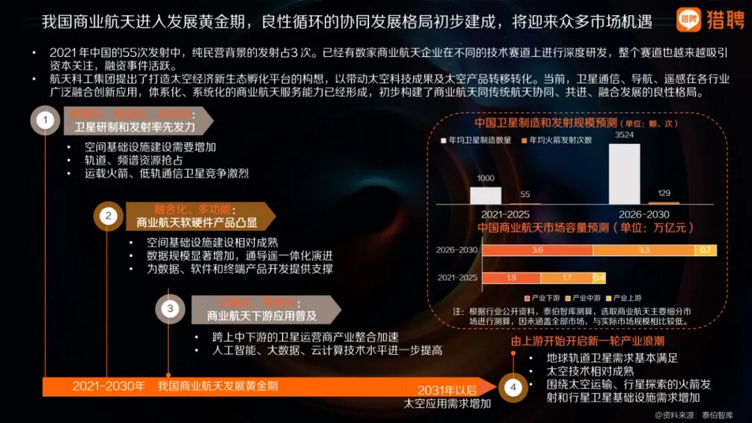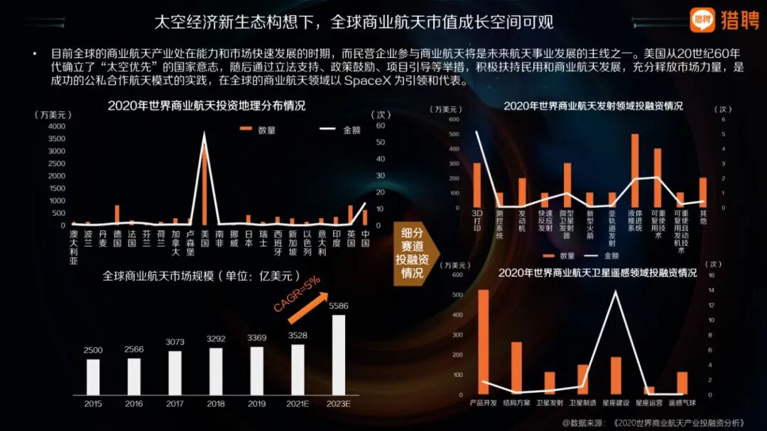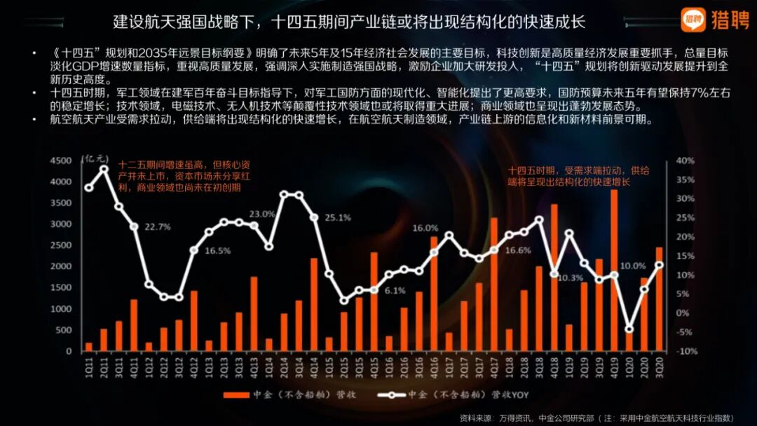 進入十四五時期,我國航空航天產業日趨成熟,正在有效地促進商業領域的開拓,如商業載人航天的快速推進和內部衛星互聯網納入“新基建”的催化,包括衛星制造、火箭發射、地面設備以及航天應用等領域,釋放巨大市場紅利迎來重大發展機遇。國家隊與民營企業攜手并進,協同快速發展,拉動航空航天產業整體市場規模持續高速增長,共赴星辰大海新征途的新時代已經到來。