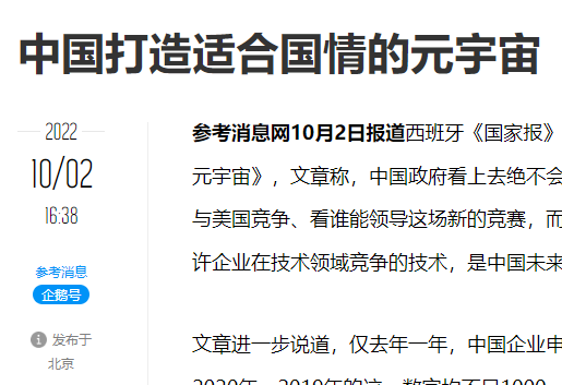 參考消息網10月2日報道西班牙《國家報》網站9月29日發表題為《這就是中國正在準備的元宇宙》,文章稱,中國政府看上去絕不會錯過元宇宙這趟列車。北京高層的主要想法不是與美國競爭、看誰能領導這場新的競賽,而是創建一個適合中國的虛擬世界。這將是一種允許企業在技術領域競爭的技術,是中國未來戰略的關鍵,同時不能影響社會穩定。