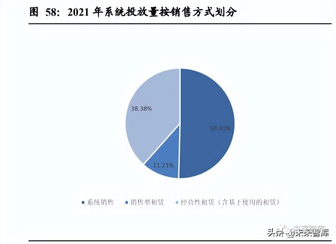 系統銷售與系統租賃相結合,新型合同助力系統靈活銷售。系統租賃包括銷售型租 賃、經營型租賃和基于使用安排的租賃。從合同方式來看:直接銷售和銷售型租賃 均出讓系統所有權,區別在于直接銷售為交易時點全款支付交易,銷售型租賃為分 期付款;經營型租賃和基于使用安排租賃承租方擁有系統使用權而非所有權,兩者 區別在于經營型租賃按期付款,且在租賃期結束時有權收購系統,基于使用安排的 租賃按系統使用次數收費。從收入確認方式來看:直接銷售和銷售型租賃在交易時 點確認收入,經營型租賃和基于使用的租賃在租賃期內以直線方式確認收入。系統 租賃為客戶提供購買系統的靈活性。
