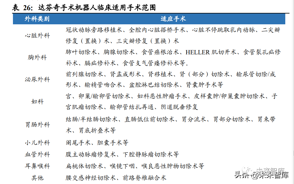 達芬奇臨床適用范圍廣泛,擴大微創手術需求。達芬奇手術機器人是目前世界范圍應用廣泛的一種智能化手術平臺,迄今有將近 70 種的達芬奇臨床應用,跨域多個臨 床專業領域:普外科、泌尿科、心血管外科、胸外科、婦科、五官科、小兒外科等 進行微創手術。數十年來,微創手術技術的發展給外科手術的發展帶來了革命性的 變化,而以達芬奇手術機器人為主的內窺鏡型外科手術機器人進一步拓寬了微創手 術的范疇,引領著微創手術的高新技術和前沿水平。達芬奇手術機器人是當今全球 唯一獲得 FDA(美國食品與藥品監督管理局)批準應用于外科臨床治療的智能內窺 鏡微創手術系統。