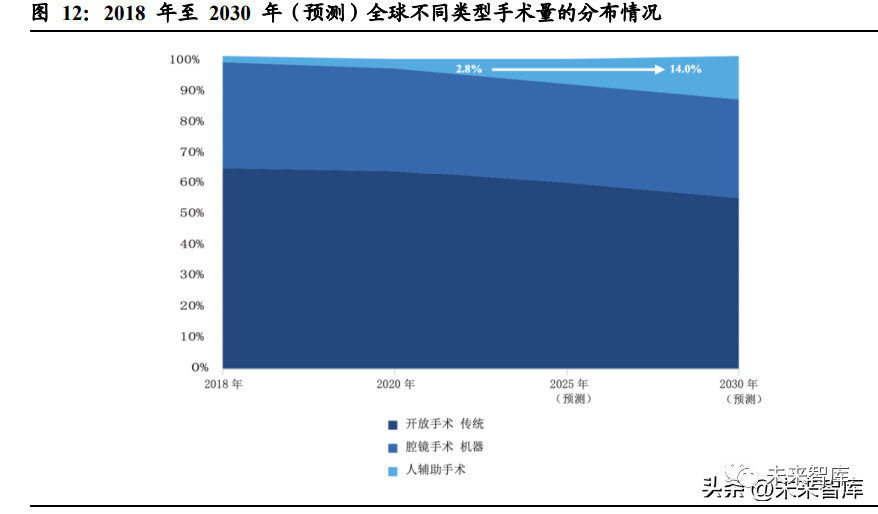 傳統開放式-腹腔鏡手術-機器人輔助式微創手術,減少病人手術風險。腹 腔手術發展趨勢由使用手工器械的傳統開放式手術,到使用小型器械通過 單個或多個微創創口介入到體內的微創手術,再到機器人輔助微創手術, 從臨床應用、手術創口和手術器械三方面逐漸減少病人手術風險。醫療手 術機器人的微創化、精準化、智能化和共享化等重大優勢使其可以通過微小創口進行遠程操控,拓展和增強手術醫生的操作能力,使得手術創傷減 小,失血、感染及并發癥風險降低,術后恢復周期縮短。