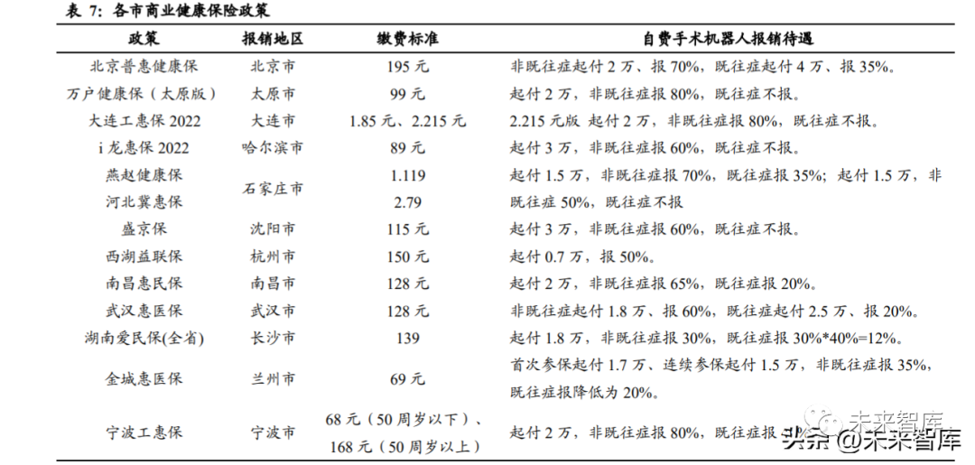 國內手術機器人使用費用高,患者進行手術經濟壓力較大。以商業化水平最高的達 芬奇手術機器人為例,手術費用由設備采購費、維護費與專用耗材費用組成。對比 于傳統腔鏡手術費用,達芬奇手術機器人輔助地腹腔鏡手術費用貴 2-4 萬元,給患 者造成較大經濟壓力。京滬率先將手術機器人納入醫保報銷名單,患者費用負擔有望降低。上海市醫保局 將腔鏡機器人手術以“人工智能輔助治療技術”的名稱納入乙類醫保,患者自付 20%, 醫保報銷范圍包括前列腺癌根治、腎部分切除、子宮全切、直腸癌根治;北京醫保 局發布文件,明確“機器人輔助骨科手術”作為輔助操作獲得政府定價,并與“一次性 機器人專用器械”共同納入北京醫保支付目錄,即患者可獲得 100%全額報銷。