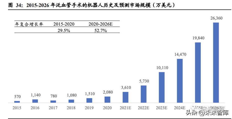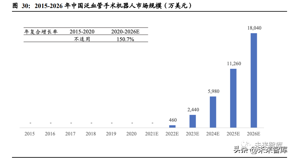 全球每年進行大量泛血管手術。根據弗若斯特沙利文的資料,全球進行的泛血管手 術數量由 2015 年的 1130 萬例增加至 2020 年的 1430 萬例,并預期將以 8.1%的復合 年增長率由 2020 年進一步增至 2026 的 2290 萬例。機器人輔助泛血管手術尚處于相對早期的發展階段,有望實現高景氣增長。受冠狀動脈血管疾病的患病率日益廣泛及泛血管手術機器人的可用性逐步提高,預 期市場將實現快速增長。在中國,2026 年市場規模估計將上升至 1.80 億美元。每年 進行的機器人輔助泛血管手術的數量預計于 2026 年增加至 139,041 例,自 2022 年 起的復合年增長率為 231.2%,2026 年的滲透率達 3.0%。隨著機器人輔助泛血管手 術的不斷滲透,新安裝的泛血管手術機器人有待放量。