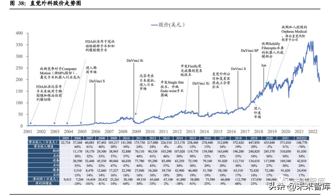 直覺外科發展經歷初創期、市場導入期、全球擴張期與快速發展期。1)1995-1999 初創時期:手術機器人技術最早來源于美國斯坦福研究院(SRI),1995 年弗雷德里 克·莫爾(Frederic Moll)成立直覺外科(Intuitive Surgical)公司,通過引入投資購 買 SRI 手術機器人專利,并組建工程師團隊。1999 年,直覺外科公司成功研制出第 一代達芬奇機器人外科手術系統。2)2000-2004 市場導入期:2000 年,公司在納斯 達克交易所成功上市獲得公募基金 4600 萬美元,多種手術產品獲得 FDA 批準。另 外直覺外科與競爭對手 Computer Motion 進行多年的專利訴訟,于 2003 年收購 Computer Motion,初步奠定手術機器人領域的龍頭地位。3)2005-2014 全球擴張期:公司分別推出達芬奇第二代 S、第三代 Si、第四代 Xi 手術系統,其手術機器人系統 逐步走向全球。隨著全球外科醫生對機器人輔助手術接受程度的提高,公司儀器配 件、系統服務隨之快速創新。4)2015 至今快速發展期:深入了解客戶體驗、完善 整體生態系統支持,堅持產品創新升級和收購布局。