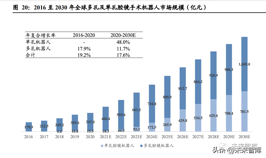 全球多孔及單孔腔鏡手術機器市場體量龐大,穩健增長。受技術進步、機器人輔助 對外科醫生及患者帶來的益處及利好政府政策等多重因素的推動,全球多孔及單孔 腔鏡手術機器人的市場規模由 2016 年 180 億元迅速增長至 2020 年的 363 億元,年 復合增長率為 19.2%。預計全球多孔及單孔腔鏡手術機器人的市場規模將持續增長 至 2030 年的人民幣 1830 億元,2020 年至 2030 年的年復合增長率 17.6%。