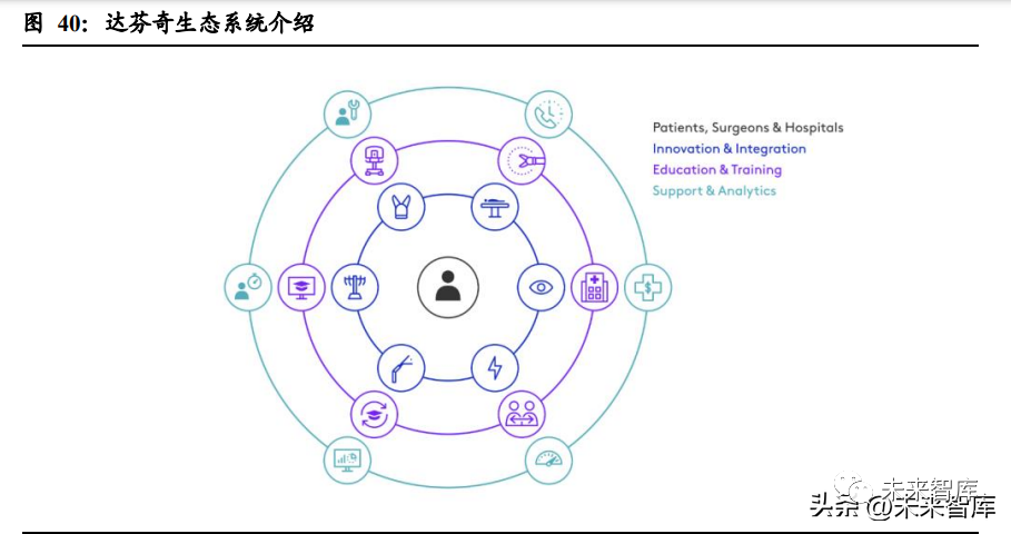 公司構建“醫護-產品技術-教育培訓-信息反饋”生態系統,形成具有凝聚力的生態圈。最核心的圈層是手術實施接受方:醫護雙方和醫院系統;其外圈層是公司的一體化 的產品和技術革新,這個部分為手術提供器材支撐;再外圈層是醫護人員和技術研 發人員的教育和培訓,這個部分為系統器材的正常運轉提供保證;最外圈層是醫護 人員對設備更新提供的信息反饋和支持,有助于進一步更新手術機器人的系統。“醫 護-產品技術-教育培訓-信息反饋”四者形成良性循環,構成達芬奇生態圈生態圈。