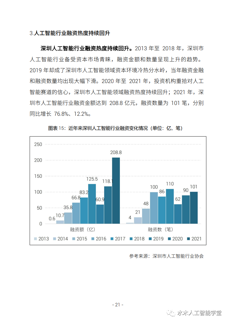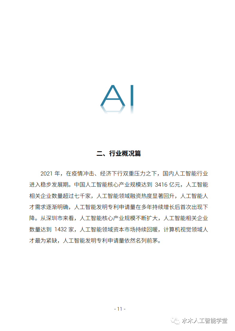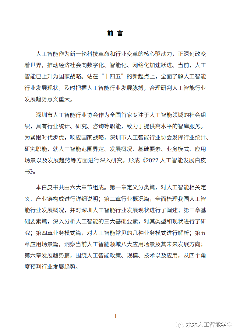 人工智能作為新一輪科技革命和行業變革的核心驅動力,正深刻改變著世界,推動經濟社會向數字化、智能化、網絡化加速躍進。當前,人工智能已上升為國家戰略。站在“十四五”的新起點上,全面了解人工智能行業發展現狀,及時把握人工智能行業發展脈搏,合理研判人工智能行業發展趨勢意義重大。2022年,依托行業數據庫,在廣泛調研的基礎上,協會繼續發揮行業統計、研究職能,就人工智能范圍界定、行業發展概況、基礎要素、業務模式、應用場景以及未來發展趨勢等方面進行深入研究,形成《2022人工智能發展白皮書》。《2022人工智能發展白皮書》以人工智能產業鏈為中心展開闡述,通過對中國人工智能行業發展現狀進行深入洞察,系統梳理了人工智能基礎要素、業務模式和應用場景,前瞻預判未來人工智能發展將呈現的趨勢。第一章定義分類篇,是對人工智能及企業相關定義、產業鏈構成進行詳細說明;第二章行業概況篇,全面梳理我國人工智能行業發展概況,并對深圳人工智能發展現狀進行了闡述;第三章基礎要素篇,深入分析人工智能的三大基礎要素,對其類型和現狀進行了研究;第四章業務模式篇,對人工智能常見的幾種業務模式進行解析;第五章應用場景篇,洞察當前人工智能領域重點應用場景及其未來發展方向;第六章趨勢展望篇,結合人工智能政策、規模、技術以及應用,從四個角度來預判行業發展趨勢。![]()