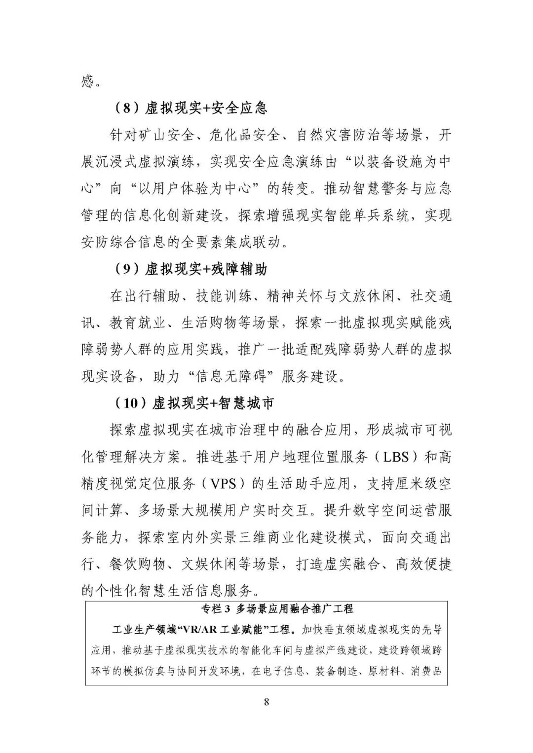 該行動計劃稱,要面向規模化與特色化的融合應用發展目標,深化虛擬現實在行業領域的有機融合,推動有條件的行業開展規模化應用試點。 第一,在“虛擬現實+工業生產”方面,圍繞重點垂直行業領域,推動虛擬現實和工業互聯網深度融合,促進工業生產全流程一體化、智能化。 第二,在“虛擬現實+文化旅游”方面,推動文化展館、旅游場所、特色街區開發虛擬現實數字化體驗產品,讓優秀文化和旅游資源借助虛擬現實技術“活起來”。 第三,在“虛擬現實+融合媒體”方面,推廣虛擬現實全景攝像機、三維掃描儀、聲場麥克風、裸眼沉浸式呈現等設備,支持建設虛擬現實音視頻專區與影院,探索基于虛擬化身等新形式的互動社交新業態。 第四,在“虛擬現實+教育培訓”方面,在中小學校、高等教育、職業學校建設一批虛擬現實課堂、教研室、實驗室與虛擬仿真實訓基地,面向實驗性與聯想性教學內容,開發一批基于教學大綱的虛擬現實數字課程,打造支持自主探究、協作學習的沉浸式新課堂。 第五,在“虛擬現實+體育健康”方面,聚焦“大體育,大健康”發展需求,面向體育用品、運動設施、健身軟件及平臺,推動虛擬現實終端及內容兼容適配,推動虛擬現實在醫學教育、臨床診治、康復護理、成癮戒斷、心理輔導、關懷探視、手術導航等場景應用落地。 第六,在“虛擬現實+商貿創意”方面,在智慧家裝、虛擬看房、大型會展、時尚創意、視頻會議、遠程辦公、智慧商圈、外賣零售等領域,落地推廣一批虛擬現實技術支撐的典型案例,發展線上線下同步互動、有機融合的商貿活動體驗新模式,打造商貿新場景、新業務。 第七,在“虛擬現實+演藝娛樂”方面,搭建常態化的虛擬現實線上演播攝制播出環境,支持舞臺藝術、綜藝、非物質文化遺產等優質資源網絡展演,開展沉浸式業態體驗落地推廣活動。 第八,在“虛擬現實+安全應急”方面,針對礦山安全、危化品安全、自然災害防治等場景,開展沉浸式虛擬演練,實現安全應急演練由“以裝備設施為中心”向“以用戶體驗為中心”的轉變。 第九,在“虛擬現實+殘障輔助”方面,在出行輔助、技能訓練、精神關懷與文旅休閑、社交通訊、教育就業、生活購物等場景,探索一批虛擬現實賦能殘障弱勢人群的應用實踐。 第十,在“虛擬現實+智慧城市”方面,探索虛擬現實在城市治理中的融合應用,形成城市可視化管理解決方案。