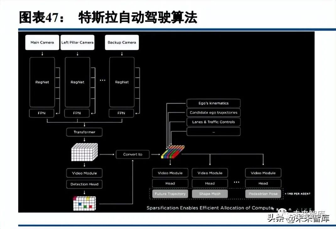 視覺 Transformer 正推動自動駕駛向前邁進。自動駕駛初期階段,主要目標是讓汽車在單車道內行駛,隨 著駕駛復雜性,需要對路況進行影像提取與 3D 建模等。特斯拉自動駕駛算法使用的是多任務學習 HydraNets 架構,從而讓汽車共享相同神經網絡或特征提取器的 同時能進行交通燈檢測、車輛避讓等多項任務。特斯拉自動駕駛算法中,首先讓車載攝像頭使用 RegNet(殘差網絡)對路況/汽車進行原始圖像提取。在每個攝像頭都處理完單個圖像后,使用具有多頭自注意力的 Transformer 模型進行處理,Transformer 模型不僅解決了 CNN 算法在 BEV(鳥瞰圖)遮擋區域預測問題,同 時還有更高的性能和算法準確度。后續將處理結果進行多尺度特征、視頻神經網絡等處理,從而完成整個自動 駕駛算法。近年來 Transformer 憑借傳統 CNN 算法所不能企及的感知能力以及其優秀的魯棒性和泛化性,已 逐步取代 IPM、Lift-splat、MLP 成為 BEV(鳥瞰圖)感知領域的主流算法。