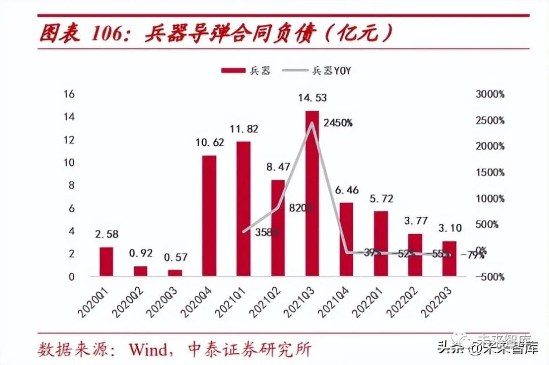 從在建工程來看,除 2021 年個別季度外, 在建工程始終處于高位,且近四個季度呈環比增長的趨勢,機載導彈 正加速擴產。從合同負債來看,2021Q2 相關軍機標的兌現大額合同負債,航空導彈標的也同樣兌現了大額合同負債,預示大額合同的簽訂, 至今合同負債仍處于高位,訂單飽滿。展望 2023 年,隨著相關企業產 能擴充逐步完成,航空機載導彈將持續兌現高速增長。
