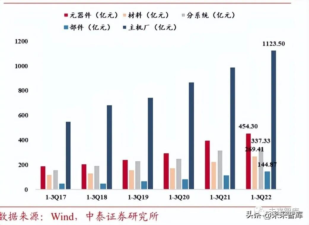 盈利能力方面,上游元器件、中游分系統賽道毛利率穩步提升,中游 部件凈利率逆勢上漲。2022 年前三季度,元器件板塊毛利率 47.32%, 同比提升 0.01pct,凈利率 24.11%,同比下降 0.03pcts,盈利能力保 持為穩定;材料板塊實現毛利率 30.55%,同比下降 0.26pct,凈利率 實現 17.33%,同比下降 0.04pct;分系統板塊實現毛利率 31.31%,同 比提升 0.46pct,凈利率實現 9.95%,同比下降 1.21pct;部件板塊實 現毛利率 34.85%,同比下降 1.51pct,凈利率實現 19.14%,同比提升 0.59pcts;主機廠板塊實現毛利率 9.52%,同比下降 0.91pct,凈利率 實現 4.02%,同比下降 0.47pct。