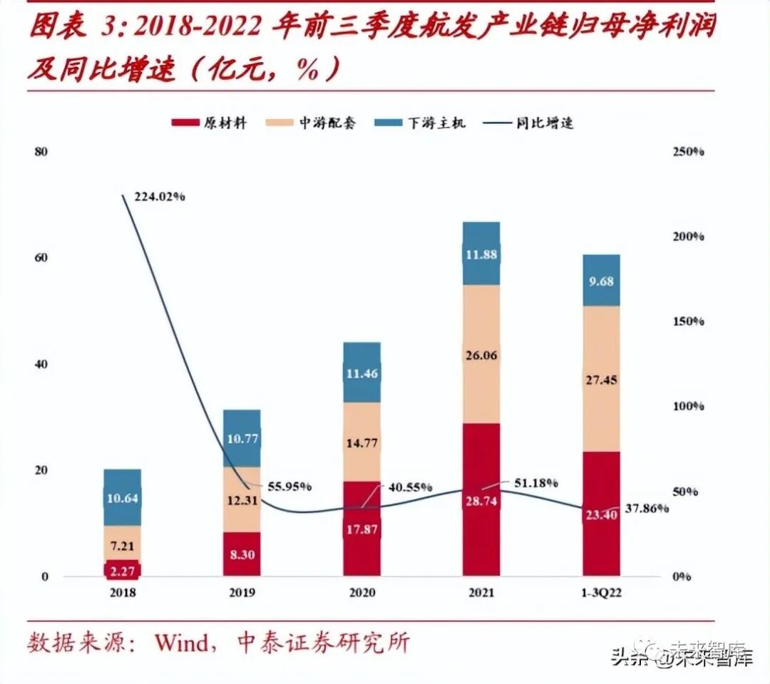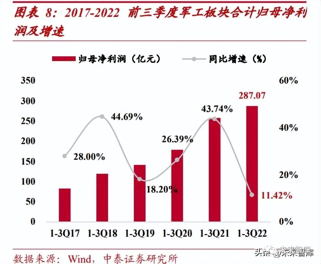 2)材料:增速放緩背景下,細分賽道受原材料價格和業務條線布局影 響有所分化。2022 年前三季度,材料板塊實現營業收入 269.41 億元, 同比增長 19.56%;實現歸母凈利潤 44.97 億元,同比增長 17.75%。①發動機:前三季度受鎳價波動影響,對部分高溫合金企業業績增速 造成拖累,隨著成本端壓力緩解和發動機列裝換裝需求放量,業績增 速有望持續提升;②飛機:鈦合金企業受制于產品價格下行和海綿鈦 高位運行影響,業績增速有所放緩;碳纖維企業得益于需求旺盛疊加 高利潤率新品貢獻擴大,業績保持較高增速;③特種材料:受益于先 進武器放量和迭代發展對先進材料提出高質高量要求背景下,如華秦 科技、光啟技術和鉑力特等特殊材料企業保持較高業績增速,未來有 望持續受益。