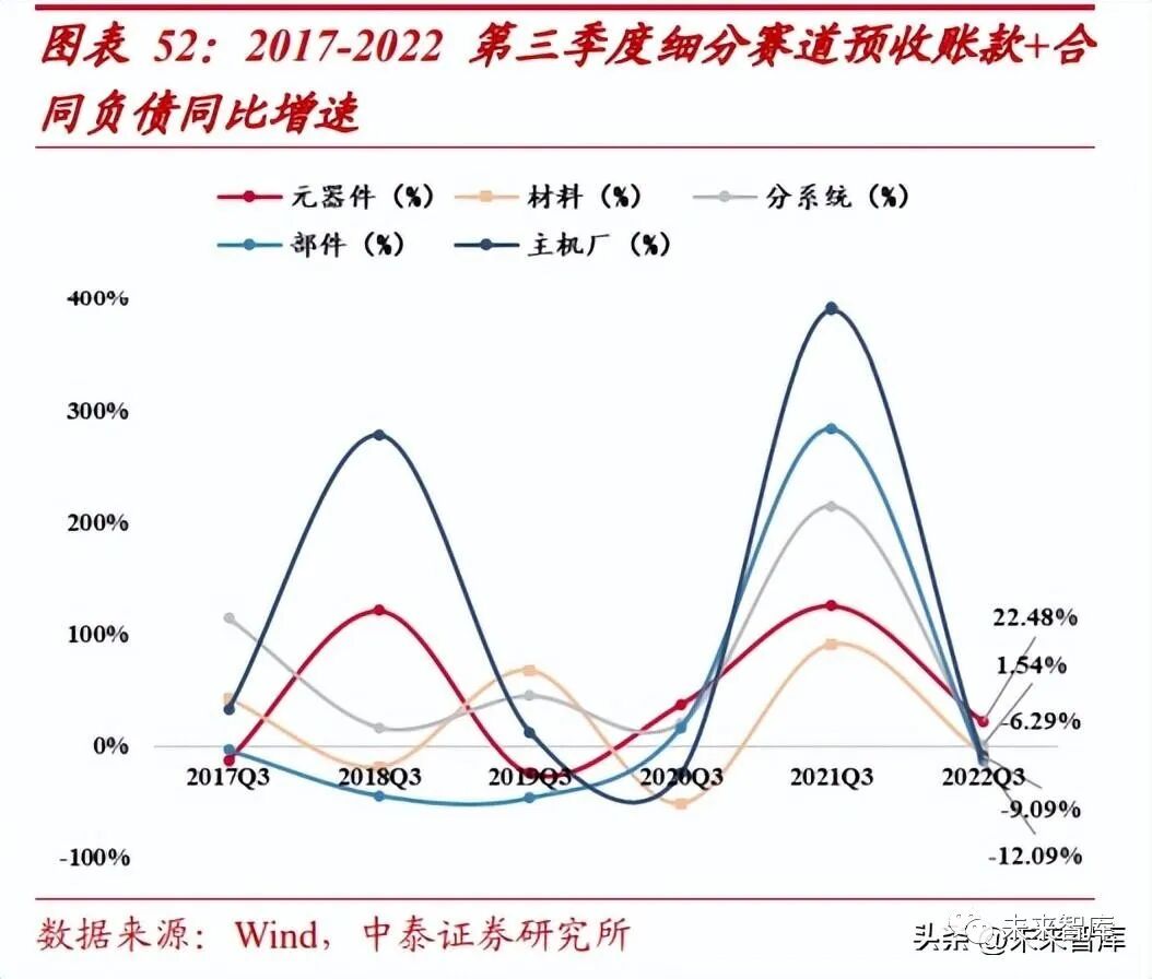 從前瞻指標來看,主機廠向上游采購增速提升明顯,產業鏈備產備料 積極。截至 2022Q3,①元器件:板塊應付票據及應付賬款合計 217.30 億元,同比增長 13.62%,存貨合計 230.39 億元,同比增長 29.27%, 存貨高速增長或系需求旺盛疊加疫情影響交付節奏所致,隨著疫情影 響減弱,存貨有望轉化為收入;②材料:板塊應付票據及應付賬款合 計 109.76 億元,同比增長 26.05%,存貨合計 139.95 億元,同比增長 16.20%;