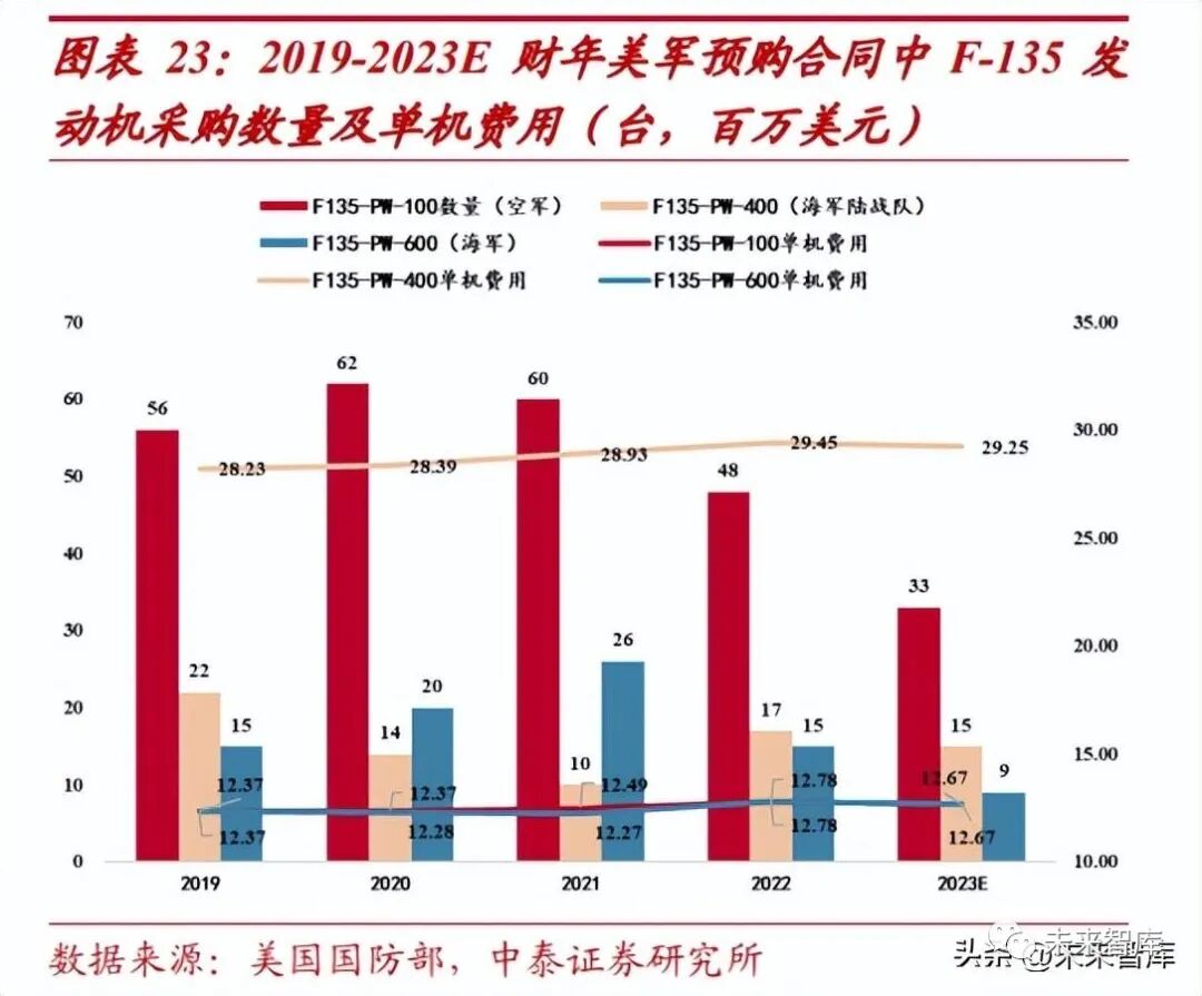 近兩財年美軍對第四代發動機 F135 采購數量下滑,第五代發動機或于 2028 財年小批量生產。根據美國國防部 2023 財年空軍和海軍采購預 算,計劃花費 9.71 億美元用于采購 57 臺 F-35 發動機,其中裝配 F-35A 戰斗機的 F135-PW-100 發動機 33 臺(單機費用 1267.1 萬美元),用 于空軍;裝配 F-35B 戰斗機的 F135-PW-400 發動機 15 臺(單機費用 2925.0 萬美元),用于海軍陸戰隊;裝配 F-35C 戰斗機的 F135-PW-600 發動機 9 臺(單機費用 1267.1 萬美元),用于海軍。