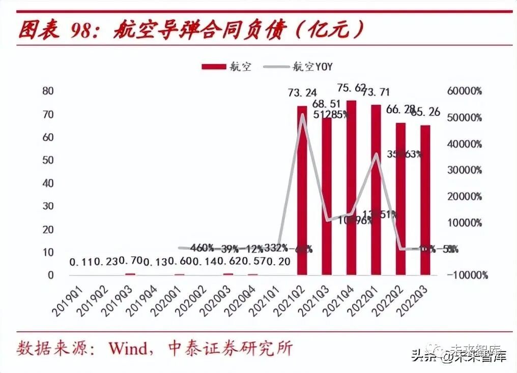 2021 年中報,中航沈飛合同負債較年初增長 697.99%、 航發動力增長 784.69%;2022 年中報,中航西飛合同負債較年初增長 301.50%;2022 年 12 月,中直股份發布《關于調整 2022 年度日常關 聯交易預計額度及預計 2023 年日常關聯交易的公告》,預計 2023 年 中航財務公司存款上限金額為 130 億元,較 2022 年截至披露日已發生 余額增加 1326.62%,主要系預計將在 2023 年收到客戶大額預付款所 致,或表明公司大額訂單落地在即。十四五開端之年以來,我國航空 產業正處于新機型放量初期,終端型號列裝需求節奏具備延續性,展 望未來新機型有望陸續開始批產,帶動行業長期高速增長。