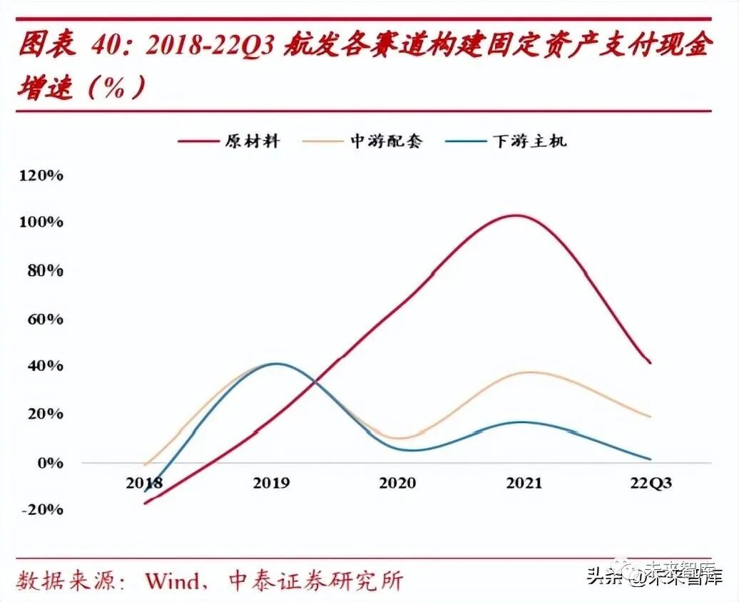 從前瞻指標來看,產業鏈整體于 2019 年開始密集產能擴充,2021 年 為新一輪產能布局高峰,目前處于產能建設快速爬坡階段。軍工“以 銷定產”特性明顯,受益于發動機成熟型號放量和新型號進入批產節 點,2019 年和 2021 年全產業鏈購建固定資產、無形資產和其他長期 資產支付的現金增速為 38.19%和 36.86%,表明全產業鏈自 2019 年 擴產提速;一般項目建設周期為 2-3 年,2021 年和 2022 年 Q3 固定 資產凈值增速分別為 8.69%和 13.02%,表明 2022 年起全產業鏈產能 快速爬坡,上中下游各環節產能瓶頸逐步擊破,產能快速釋放或給予 業績增長保障。