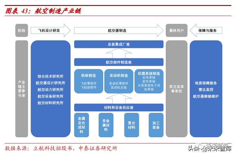 飛機制造業通常采取“整機制造商—多級供應商”的制造模式,主機 廠推行“小核心大協作”發展模式,為上游零部件生產企業帶來重大 發展機遇。產業鏈的第一級為整機制造商,主要從事產品設計、總裝 制造、市場營銷、客戶服務和適航取證環節;第二級為關鍵航空子系 統制造商,所提供的子系統包括機體、發動機、航空電子等主要機載 設備;第三級主要包括眾多為產業鏈上層的整機與子系統制造商提供 零部件與材料的供應商。航空航天零部件制造是航空航天制造業的基 礎性子行業,是實現航空航天材料向關鍵子系統和整機制造轉變的重 要環節,具有產品門類繁多、工藝路線復雜和產品精密度高的特點。