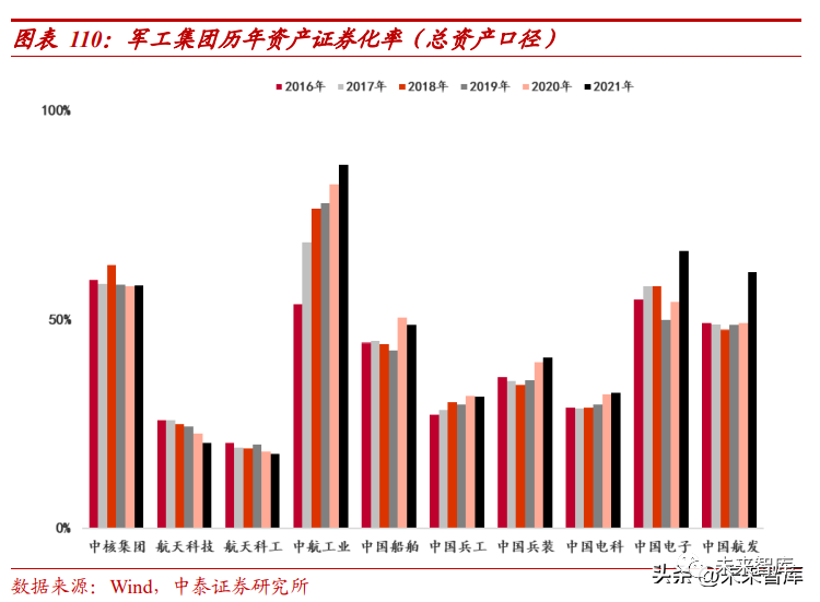 十大軍工央企總資產超過5萬億,未來資產證券化提升空間巨大。國防 軍工行業涉及核、航空、航天、船舶、兵器、電子等多個行業,目前 共有中國核工業集團公司、中國航天科技集團公司、中國航天科工集 團公司、中國航空工業集團公司、中國航空發動機集團公司、中國船 舶集團公司、中國兵器工業集團公司、中國兵器裝備集團公司、中國 電子科技集團公司、中國電子信息產業集團有限公司十大軍工集團, 據我們統計共有114家下屬公司在A股上市。受資產屬性、管理制度等 因素制約,超過5萬億總資產中的科研院所、防務業務等核心軍工資產長期處于上市公司體外,呈現出明顯的“小資產 大集團”的特點。從總資產統計口徑看,各大軍工集團資產證券化率 大多處于30%到50%區間,相比國外軍工企業70%-80%的資產證券化 率還有較大的提升空間。