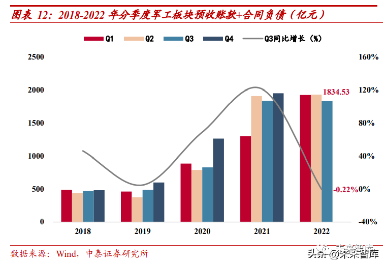 2022Q3 行業合同負債仍維持高位,訂單需求飽滿。合同負債+預收賬 款是反映在手訂單的重要前瞻指標,2022Q3,軍工行業整體合同負債 金額為 1834.53 億元,同比下降 0.22%,環比下降 5.09%,2021Q2 主機廠大額訂單落地,步入收入擴充和利潤兌現階段,行業在手訂單 充足需求旺盛,為行業中長期業績增長奠定堅實基礎。