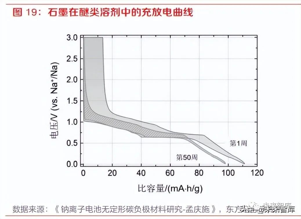 石墨儲鈉容量十分有限,改進方式存在較大局限性。由于鈉離子與石墨層間的相互作用弱,鈉離 子難以與石墨形成類似 LiC6 的結構穩定的插層化合物。因此石墨儲鈉容量很低,導致石墨作為鈉 離子電池負極材料的比容量非常低,只有 35mAh/g。使用醚類溶劑代替碳酸酯溶劑可以將石墨的 可逆比容量提升至 110mAh/g,但該共嵌入方式也有很大的局限性,一是溶劑共嵌入現象只適用 于醚類電解液,而醚類電解液在高壓下易分解,全電池工作電壓難以提升;二是石墨在醚類溶劑 中的儲鈉容量仍然較低,會消耗溶劑,而且儲鈉電位較高,體積變化較大,會降低全電池的能量 密度,對循環壽命產生不利影響。
