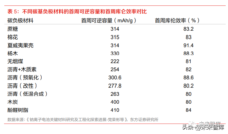 無煙煤前驅體性價比高,克容量不及硬碳。中科海鈉以無煙煤等煤基材料為主體,以瀝青、石油 焦等軟碳前驅體為輔材,制得的負極材料成本低廉,同時具有較好的電化學性能。裂解無煙煤得 到的是一種軟碳材料,但不同于來自瀝青的軟碳材料,在 1600°C 以下仍具有較高的無序度,產 碳率高達 90%,儲鈉容量達到 220mAh/g,循環穩定性優異。與硬碳負極相比,無煙煤的克容量 仍有一定差距,但其在所有的碳基負極材料中具有最高的性價比,有望應用于中低端領域。