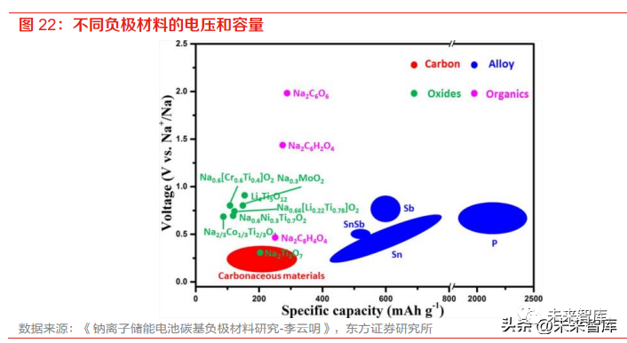 非碳類材料商業化難,無定形碳主導地位穩固。合金類材料具有理論容量較高,導電性良好的特 點,然而此類材料反應動力學較差, 且反應時體積膨脹嚴重,所以目前實際應用存在較大困難。金 屬氧化物材料具有成本低、理論容量較高等優點,但導電性較差,充放電過程中也存在體積變化巨大等問題,從而導致倍率性能和循環穩定性較差,一般需要通過碳包覆、納米化等手段進行改 性。因此非碳類材料預計在較長時間內都難以實現產業化。無定形碳具有較高的儲鈉容量和良好 的循環性能等優點,是目前最具有商業化應用前景的鈉電池負極材料。