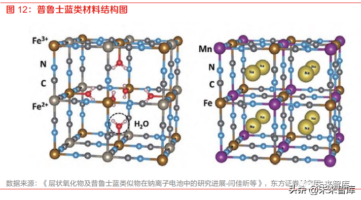 普魯士藍類材料理論容量高而成本低,結晶水缺陷制約應用。普魯士藍類材料主要包括普魯士藍 類化合物(PB)NaxFe[Fe(CN)6] 及過度金屬六氰合鐵酸鹽(PBA)NaxM[Fe(CN)6]。普魯士藍材 料為面心立方晶體結構,過渡金屬離子分別與氰根中的 C 和 N 形成六配位,堿金屬離子處于三維 通道結構和配位孔隙中。這種大的三維多通道結構可以實現堿金屬離子的嵌入和脫出,因此普魯 士藍材料具有高理論比容量,高工作電壓,較長的循環壽命和較優的倍率性能。但由于內部結晶 水的存在,材料極易形成缺陷,材料實際比容量和電化學性能均受到影響,且材料高溫受熱易分 解,存在一定的安全隱患。