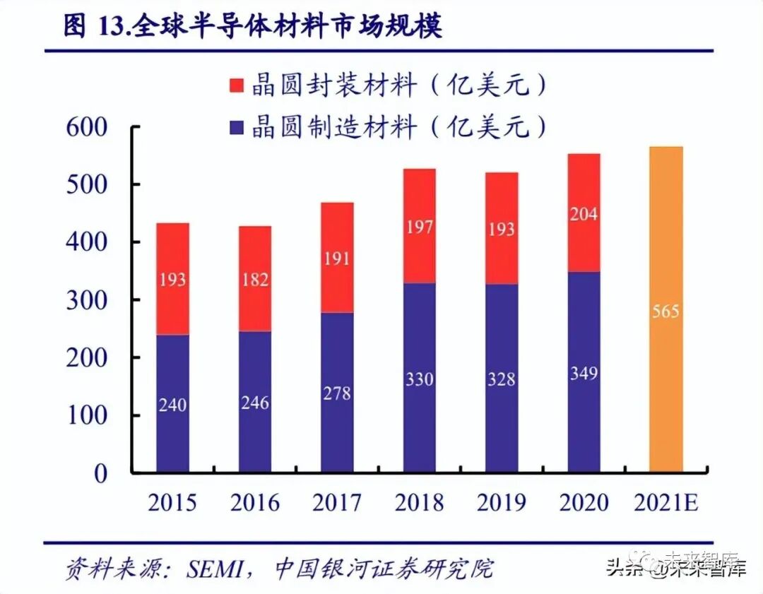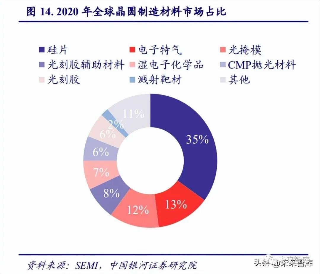 晶圓制造材料占比逐步提高,硅片是最大的半導體材料單一市場。從半導體材料結構分布 來看,2020 年晶圓制造材料規模達 349 億美元,占總材料比重從 2015 年的 55%增長到 2020 年的 63%。根據 SEMI 數據,2020 年硅片市場規模達 122 億美元,占據晶圓制造材料總規模 的 35%,遠超其他制造材料穩居第一,是最大的半導體材料單一市場,電子特氣和光掩模市場 規模位列第二、三位,分別為 45 和 42 億美元,而其他制造材料占比均不足 10%。