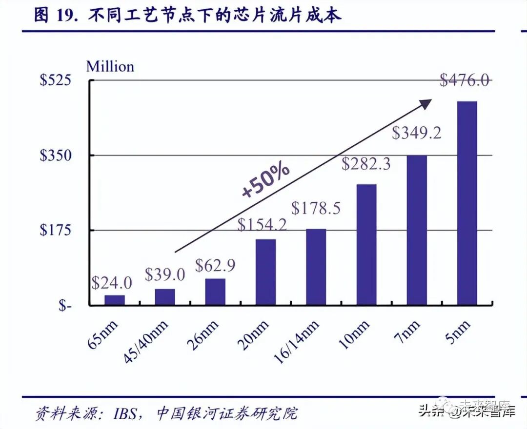 制程的進步推動半導體材料價值量增加,需求相應進一步提升。摩爾定律是指集成電路上 可容納的元器件的數目,約每隔 18-24 個月便會增加一倍,性能也將提升一倍。在摩爾定律下, 芯片工藝制程的技術節點不斷向前邁進,半導體制造材料的成本也不斷上升,從而推動半導體 材料的需求提升。根據 IBS 數據顯示,每當向前推進一個節點時,流片成本將提升 50%,其中 很大部分是由于半導體制造材料價值提升所致。以光掩膜為例,在 16/14nm 制程中,所用掩膜 成本在 500 萬美元左右,到 7nm 制程時,掩膜成本迅速升至 1500 萬美元。
