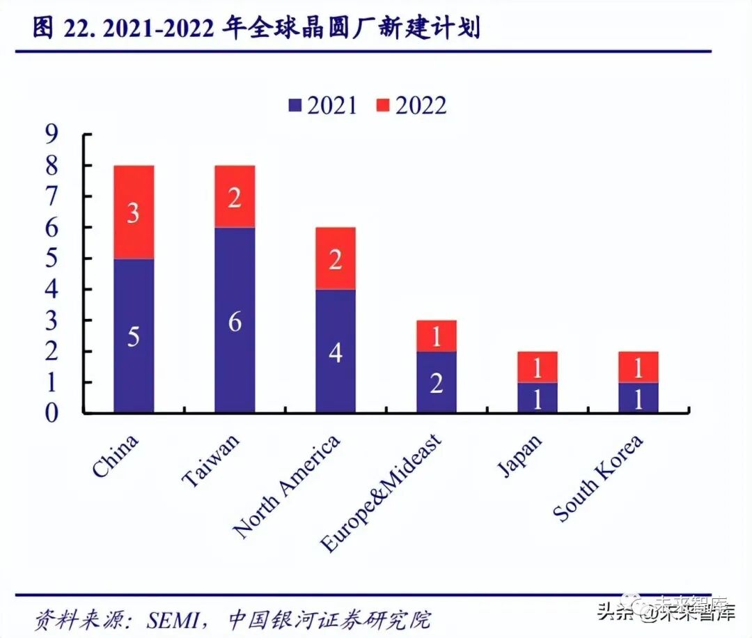 2022-2023 年新增產能將迎來集中釋放,屬于后周期的半導體材料將迎來爆發。在半導體 整個生產周期中,半導體材料雖處于產業鏈上游,但從晶圓廠擴產角度看,半導體材料采購是 在晶圓廠建設完工并下達訂單后開始進行,因此半導體材料屬于半導體周期偏后的環節。本輪 半導體缺貨爆發于 2020 年下半年,考慮到疫情導致的建設施工延誤,實際晶圓廠大幅擴產主 要從 2020 年底開始,晶圓廠的建設周期大約需耗時 1 -2 年,我們認為 2022-2023 年新增產能 將迎來集中釋放,相應有望拉動半導體材料需求爆發增長。