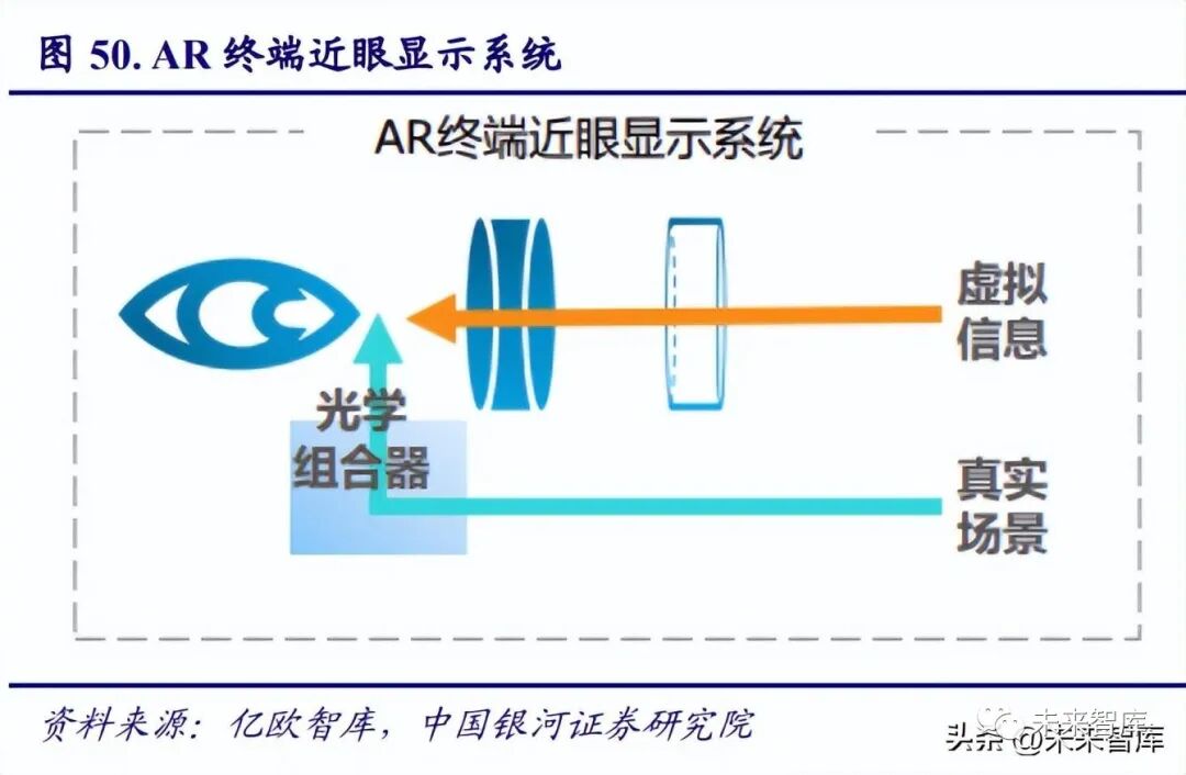 光學器件為 VR/AR 核心零部件。光學器件主要用于放大屏幕圖像提供合適的 FOV(視場 角);幫助人眼聚焦看到清晰的屏幕,是 VR/AR 產業鏈中的核心零部件之一。近眼顯示系統 是 VR/AR 硬件設備的核心所在,也是 VR/AR 硬件主要差異所在:VR 設備直接向用戶顯示虛 擬圖像;AR 設備則需要將虛擬信息“層疊”在現實場景中,因此在近眼顯示系統的光學結構 上,AR 設備需要增加一層光學組合器以實現“層疊”效果。