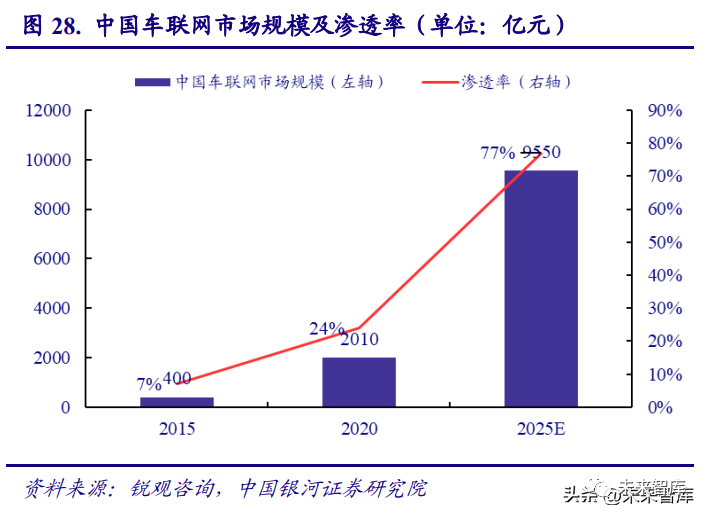 政策、資金支持,全球網聯汽車滲透率快速提升。智能網聯汽車是國際公認的未來發展方 向和關注焦點;車廠、電信商和第三方服務業者,皆看準汽車聯網后產生的大量數據,以及衍 生商用服務所帶來的收益,紛紛加大對車聯網領域的資本開支。在資金、政策及 5G 等新興技 術發展的三重推動下,全球網聯汽車滲透率快速增長:據拓璞產業研究院預測,到 2025 年全 球新車市場聯網汽車的數量將接近 7,400 萬輛,滲透率將突破 80%,全球車聯網市場規模將接 近 17,00 億元。據銳觀咨詢數據統計,在 5G 快速建設與產業鏈成熟度快速提升的推動下,2020 年我國 V2X 用戶超過 6,000 萬人,市場規模為 2010 億元,預計到 2025 年我國車聯網市場規 模將突破 9,550 億元,滲透率將突破 77%。