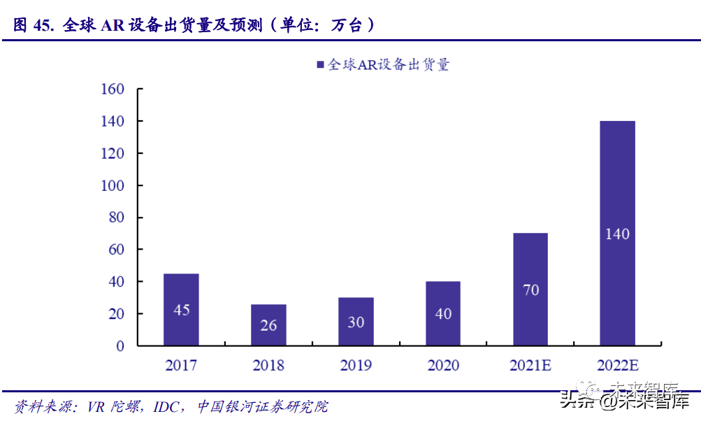 增強現實(Augmented Reality)技術是一種將虛擬信息與真實世界融合的技術。AR 將原 本在現實世界的空間范圍中比較難以進行體驗的實體信息在電腦等科學技術的基礎上,實施 模擬仿真處理,疊加將虛擬信息內容在真實世界中加以有效應用,并且在這一過程中能夠被人 類感官所感知,從而實現超越現實的感官體驗。真實環境和虛擬物體之間重疊之后,能夠在同 一個畫面以及空間中同時存在。由于 AR 光學、屏幕等核心零部件仍處于技術攻堅階段,AR 產業仍處于商用化前期:據 IDC 數據顯示,2020 年 AR 設備出貨量為 40 萬臺,預計到 2022 年將達到 140 萬臺左右。我們認為,隨著上游零部件技術升級以及下游生態的不斷完善,AR設備有望成為下一代主流移動終端設備。
