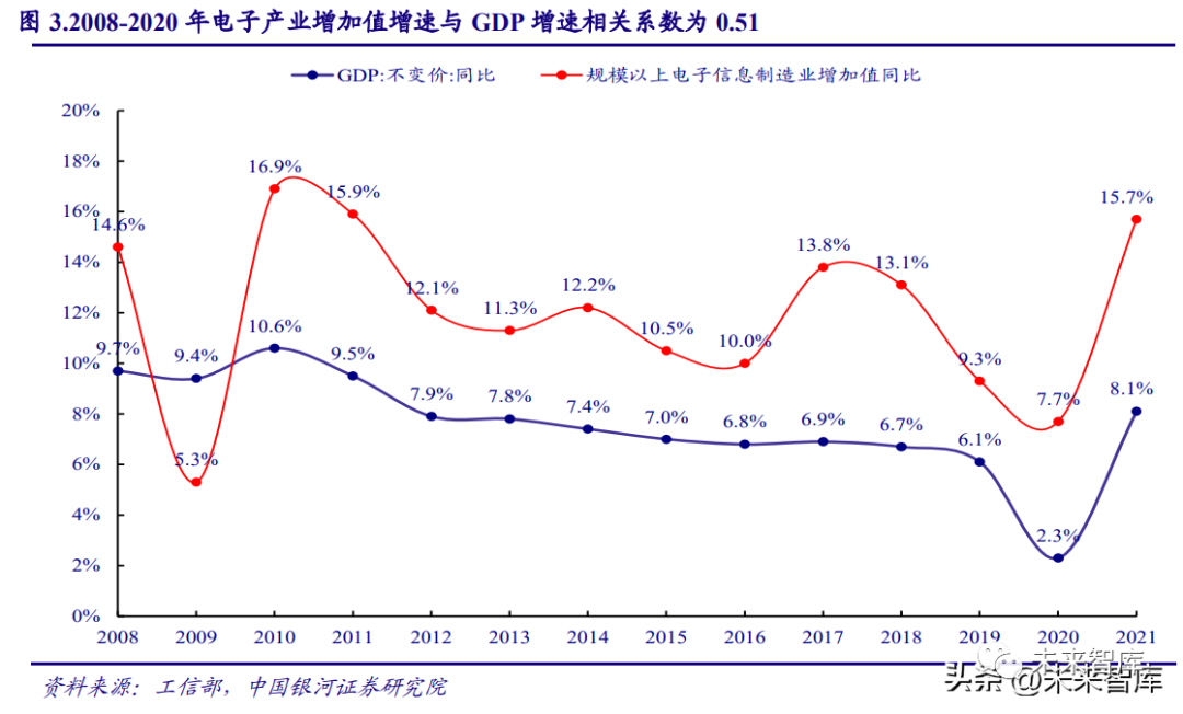 國家對于電子信息產業的扶持力度加大,產業支持政策頻出,電子產業進一步承接產能轉 移,呈現出增長明顯提速的趨勢。2020 年以及 2021 年我國電子信息產業雖受到全球新冠疫情 影響, 2020 年消費電子增速放緩,2021 年市場回暖疊加低基數影響,市場增速從 2020 年的 7.7%增加 15.7%,增加了 8 個百分點,同期 GDP 增長了 8.1 個百分點。因為國內電子產業起 步相對較晚,成長較快,整體增速高于宏觀經濟增速。2008-2021 年增加值平均增速為 12.03%, 同期 GDP 平均增速為 7.59%。