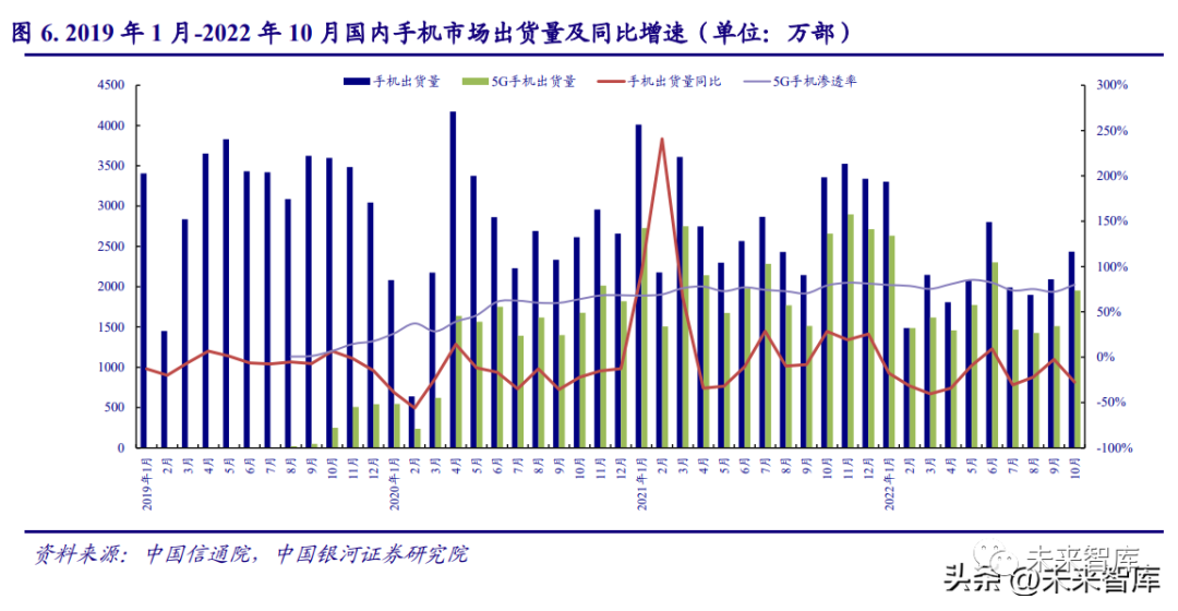 2.消費電子市場呈現結構性機會。根據中國信通院發布 2022 年 10 月國內手機市場運行分析報告,2022 年 1-10 月,國內市 場手機總體出貨量累計 2.20 億部,同比下降 21.9%,其中,5G 手機出貨量 1.73 億部,同比下 降 17.7%,占同期手機出貨量的 78.4%。2022 年 10 月,國內市場手機出貨量 2435.6 萬部,同 比下降 27.5%,其中,5G 手機 1951.7 萬部,同比下降 26.6%,占同期手機出貨量的 80.1%。2022 年 10 月,國內手機上市新機型 33 款,同比增長 26.9%,其中 5G 手機 20 款,同比 增長 25.0%,占同期手機上市新機型數量的 60.6%。2022 年 1-10 月,上市新機型累計 338 款, 同比下降 11.1%,其中 5G 手機 176 款,同比下降 6.4%,占同期手機上市新機型數量的 52.1%。