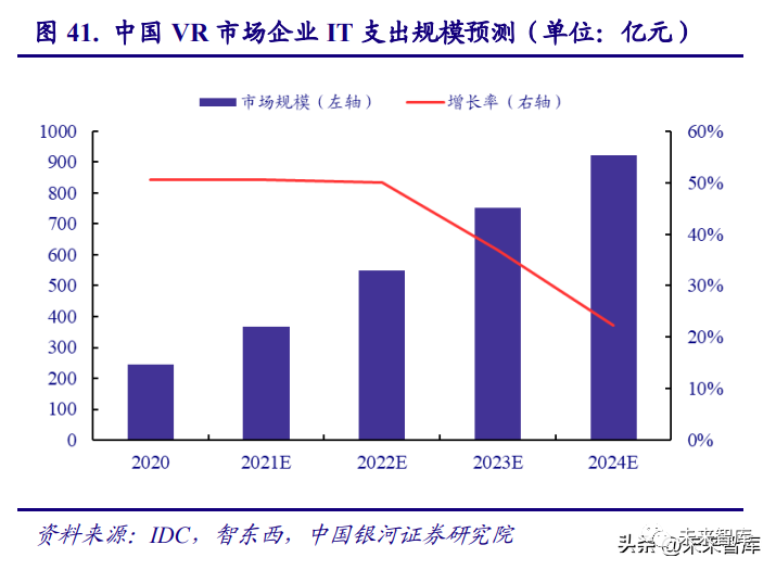商用 VR 設備密集發布,應用場景持續拓展。根據 IDC 數據顯示,VR 教育為商用 VR 的 第一大應用:VR 教育可以通過 VR 技術來構建虛擬的學習環境,如模擬宇宙中的天體運動、 化學反應等現實中較難實現或存在風險的場景;VR職業教育則主要應用于駕校、汽修等領域, 據東方時尚數據顯示,使用 VR 駕駛模擬器可以幫助駕校節省 30%-40%的運營成本。此外, VR 技術已逐漸在我國的安防、房地產、教育、醫療等領域普及,據 IDC 統計及預測,2020 年 我國商用 VR 的市場規模約為 243.4 億元,預計到 2024 年將達到 921.8 億元,CAGT 為 30.5%。