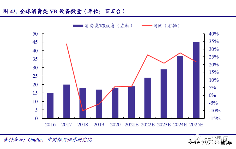 生態快速發展,消費類 VR 加速滲透。全球多家科技巨頭如 Facebook、三星、華為、小米 等均已推出 VR 頭戴設備;同時頭部廠商積極拓展軟件生態,擴展 VR 設備的用戶圈:2021 年 4 月 21 日 Oculus 舉行了首屆游戲展,發布了 12 款應用于 Quest 2 的 VR 游戲,VR 游戲生態 逐漸完善。我們認為,隨 5G 商用進程加快,VR 生態的快速成長,消費類 VR 設備將進入快 速滲透期。據 Omdia 預測,到 2025 年,VR 活躍用戶將突破 4,500 萬,消費類 VR 設備數量 有望增加至 4,500 萬臺。