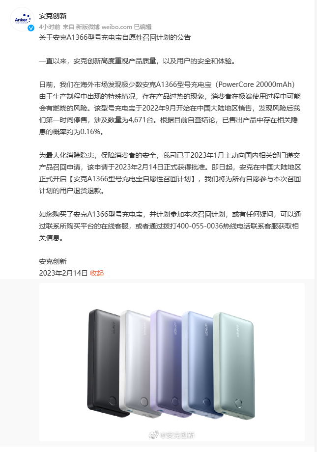Anker安克表示,用戶可以通過查看充電寶背后的名稱:535 Power Bank (PowerCore 20K) 和型號:A1366來確認是否屬于召回系列。此外,據相關媒體報道稱,安克官方已經在一些國外市場發布了召回事項,但當時還未在國內發布公告。但據調查,相關20000mAh 30W雙向充電寶已在國內電商平臺下架,無法進行購買,預計不久后會公布相應召回內容。于是今日,安克正式在其官博對此次召回情況進行說明回應,Anker安克官方現發布公告稱,在海外市場發現極少數安克A1366型號充電寶,存在過熱現象,可能有燃燒風險,已售出產品中存在相關隱患的概率約為0.16%。據介紹,Anker安克目前已主動向相關主管部門提交了產品召回申請,國內的審批流程正在進行當中,該品牌將在得到批復后的第一時間正式開啟在國內的召回行動。并且據安克表示,如果消費者購買了安克A1366型號充電寶,請停止使用,后續關注安克創新官方召回聲明。據之前的報道,安克在2021年宣布稱經過世界權威市場調查機構歐睿國際研究,安克成為全球第一的數碼充電品牌,統計依據2020年零售額,安克憑借著多種多樣的蘋果配件獲得了不少消費者的關注,并在近年來,不少廠商宣布不再提供充電頭后,為用戶提供多種多樣的第三方配件選擇。目前安克相關型號的充電寶已經開始了召回,如果手中持有相關產品的消費者應立即停止使用,等待官方的召回回收,后續的相關情況還需要相關用戶保持關注。