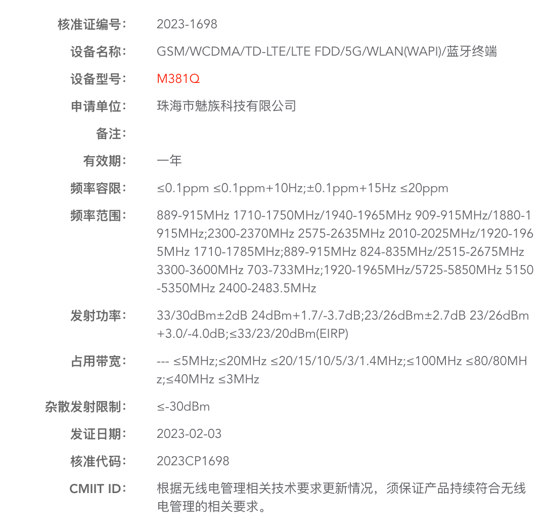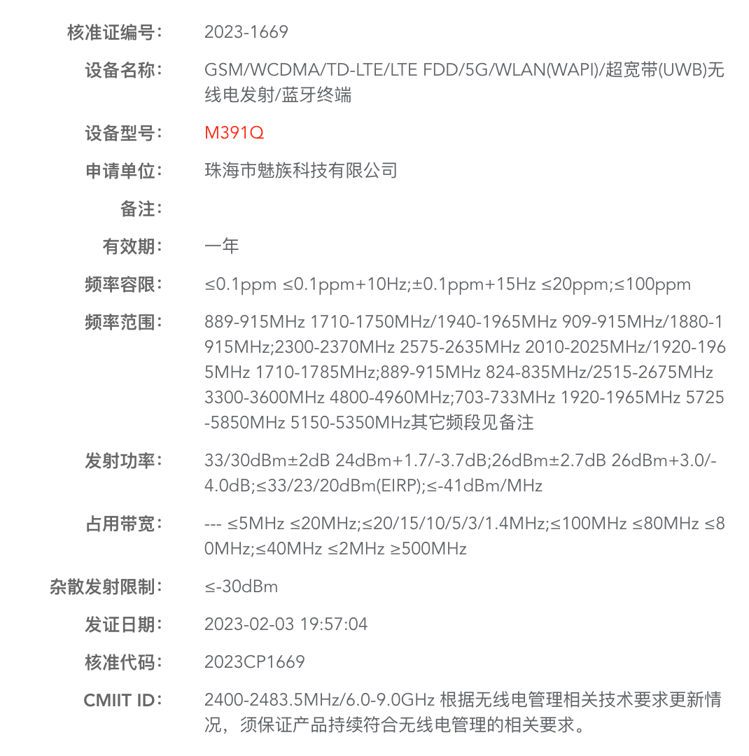 機身背部配備豎向排列的三攝,最下方則是標志性環閃。@數碼閑聊站 在評論中還透露,魅族 20 Pro 質感非常好,“標準版后攝去掉一個圓更協調,ID 沒區別,直接參考這個”。目前,魅族20系列已經通過了無線電核準。這兩款通過認證的設備型號為M381Q、M391Q,前者似乎是標準版本魅族20、后者或為定位更高的魅族20 Pro。其中,魅族20 Pro似乎會支持UWB超寬頻技術。據悉,UWB 全稱 Ultra Wide Band,也就是超寬帶通信,它是新一代的連接技術,具備厘米級精準定位能力,抗干擾能力強,傳輸速率高,能精準感知設備的空間位置。此外,魅族 20 標準版的電池組已經通過了國家質量認證,型號為 BA381。認證信息顯示,該機內置額定容量為 4600mAh(典型值 4700mAh)的電池,并支持 80W 快充。具體規格方面,魅族20系列或將搭載第二代驍龍8,配備 LPDDR5x、UFS 4.0,運行 Android 13 操作系統。綜合目前的消息來看,魅族20系列將帶來外觀設計、核心規格、電量等多方面的升級。而這一代產品也是星紀時代戰略投資后魅族的第一款旗艦設備,其實際表現如何也備受關注。