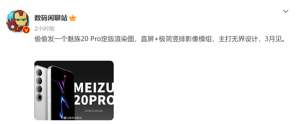 日前,@魅族科技 發文稱,“提前上手魅族 20 系列的魅友們,感覺不錯”。就此來看,魅族20系列應該已經完成產品研發,距離正式發布正在越來越近。相關爆料顯示,魅族20系列將包括魅族 20標準版和魅族 20 Pro兩款機型。今日,數碼博主 @數碼閑聊站 曝光了魅族20 Pro 的定版渲染圖,稱該機采用直屏+極簡豎排影像模組,主打無界設計,將于3 月發布。從該博主曝光的渲染圖來看,魅族20 Pro正面采用了居中挖孔直屏的設計,金屬中框,中框的邊緣較為圓潤。![]()