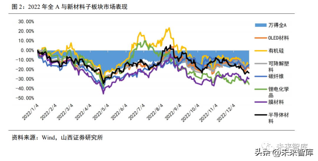 2022 年,新材料板塊表現一波三折。1 月初至 4 月末期間,“全球高通脹+地緣政治沖突+美聯儲加息啟 動+國內疫情超預期發展”的宏觀環境組合對成長風格股票形成了較為嚴重的壓制,相比于大盤,對流動性 更加敏感的新材料板塊下殺的更明顯,在此期間萬得全 A 下跌 21.9%,新材料指數下跌 28.9%。5 月初至 8 月中旬期間,國內疫情出現明顯好轉與改善,房地產銷售、工業開工與居民消費出現了邊際向好的跡象, 國內流動性較為寬裕,我們觀察到新材料板塊的修復顯著地強于大盤,在此期間萬得全 A 上漲 15.2%,新 材料指數上漲 38.8%。8 月中旬后至今,國內宏觀經濟表現轉弱,而在近期經濟與防疫政策明顯轉向調整, 新材料呈現走弱調整的態勢,萬得全 A 下跌 8.2%,新材料指數下跌 19.7%。