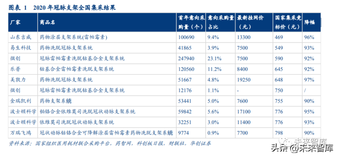 降價幅度和收益預估:支架價格從均價 1.3 萬元下降至中位價格 700 元左右,最低報價 僅 469 元。與 2019 年相比,相同企業的相同產品平均降價 93%,國內產品平均降價 92%, 進口產品平均降價 95%。按意向采購量計算,預計節約 109 億元。采購周期:2 年,自中選結果實際執行日起計算(2021 年 1 月到 2023 年 1 月)。在采購 周期內,每年簽訂采購協議。續簽采購協議時,協議采購量原則上不少于該中選產品上 年協議采購量。采購周期內醫療機構完成當年協議采購量,超出協議采購量的部分,中 選企業仍需按中選價格進行供應,直至采購周期屆滿。中標情況:8 家企業共 10 款產品中標,中標的有 6 家國內企業(微創醫療、樂普醫療、 山東吉威、金瑞凱利、易生科技、萬瑞飛鴻)和 2 家進口企業(波士頓科學、美敦力)。