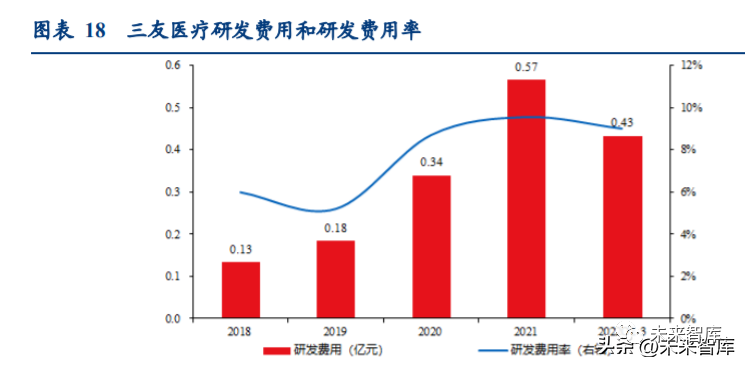 三友醫療同時持續對主流產品進行創新升級迭代,主要包括:(1)腰椎后路微創-ZinaII 代的更新迭代;(2)ZELIF 內鏡輔助下經椎間孔腰椎融合術式的升級;(3)創新側方入 路手術-Mount 側方釘板系統,配合 CLIF 側方腰椎融合術式;(4)脊柱畸形 Duetto 雙頭 螺釘的升級換代;(5)創新 UBE 雙通道內鏡減壓融合系統。有關產品在復雜脊柱畸形和 退變的微創臨床治療方面獲得了突破性進展,解決了復雜脊柱畸形在三維矯形丟失和內 固定系統斷裂失敗,退變微創治療可操作性差、安全性不高、學習曲線過長的問題,實 現了復雜脊柱畸形和退變疾病微創的安全有效治療,填補了國內空白,得到醫生和病患 的高度認可,其中 Halis9mm 腰椎融合器產品相關技術獲得中華醫學科技獎之醫學科學技 術二等獎,Lora 微創單平面技術脊柱骨折復位固定系統產品相關技術獲得高等學校科學 研究優秀成果獎科學進步獎一等獎。通過近十年持續的療法創新,公司已經在代表脊柱 最高治療水平的脊柱畸形和脊柱微創治療等方面建立起較高的品牌知名度,具有領先的 市場地位。近年來三友醫療的研發費用和研發費用率均有明顯增長。20 年和 21 年,公司研發費用分別同比增長 84%和 67%。22 年前三季度研發費用同比增長 18%。公司研發費用率從 19 年的 5.2%提升到 21 年 9.5%,22 年前三季度研發費用率為 9%,保持在高位。