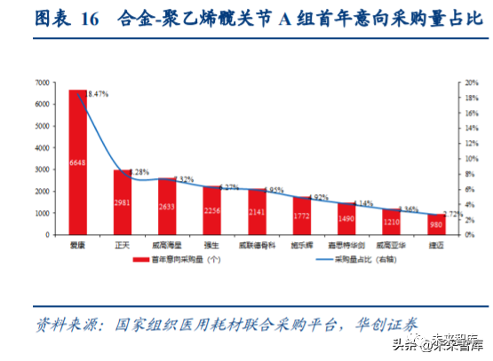 在綜合考慮產品管線豐富度、產品口碑、銷售能力、配送體系等因素后,醫院報量上更 傾向于國產龍頭企業。以關節集采為例,意向采購量按參加本次集中帶量采購的每一家醫療機構報送各產品系 統采購需求量的 90%累加得出,其中髖關節產品系統首年意向采購總量為 305542 個,膝 關節產品系統首年意向采購總量為 231976 個。臨床需求量大的產品被分到 A 組。從 A 組首年意向采購量來看,國產關節企業已逐漸占領更多市場份額。國產與進口在髖關節 需求數量相當,髖關節產品中,愛康醫療意向采購量登上榜首,數量為 45917 個,其中 陶瓷-聚乙烯、合金-聚乙烯兩類產品系統排名第一。在膝關節產品上,進口產品需求量為 國產的近 1.5 倍。膝關節產品中,愛康醫療意向采購量第二,數量為 30933 個。關節 A 組首年意向采購量來看,國產占比近 46%,醫療器械藍皮書數據顯示,2019 年國產關節 國產化率 28%左右,集采效應明顯顯現。