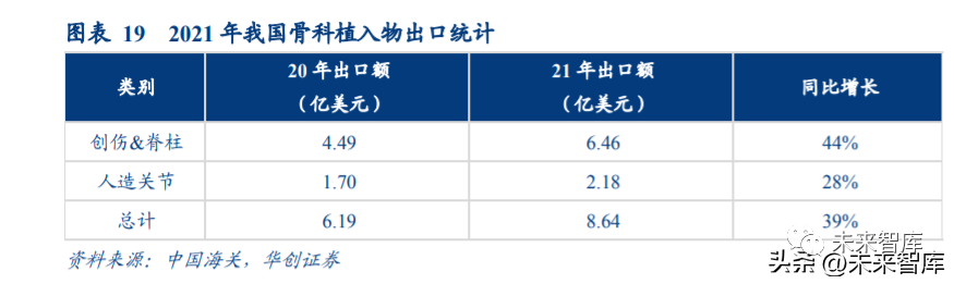 國際骨科市場比國內市場規模更大。根據《The Orthopaedic Industry Annual Report 2021》 報告,2020 年全球骨科市場中,美國以 312 億美元的份額占比第一,達 65.7%;EMEA 以 17.9%的占比居第二位;亞太地區 12.9%;其余地區占比 3.5%。根據海關數據,2021 年中國骨科植入物出口持續回暖,出口額約 8.64 億美元,同比上年 增長 39%。其中細分市場-創傷&脊柱出口額約 6.46 億美元,同比上年增長 44%;關節出 口額約 2.18 億美元,同比上年增長 28%。